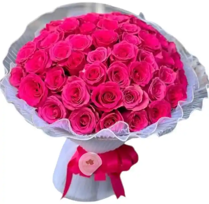 "Un espectáculo de color. Este ramo de 60 rosas fucsia es un lujo floral que llena de vida cualquier espacio." BOUQUET CON: 60 ROSAS FUCSIA MALLA DECORATIVA Y TARJETA