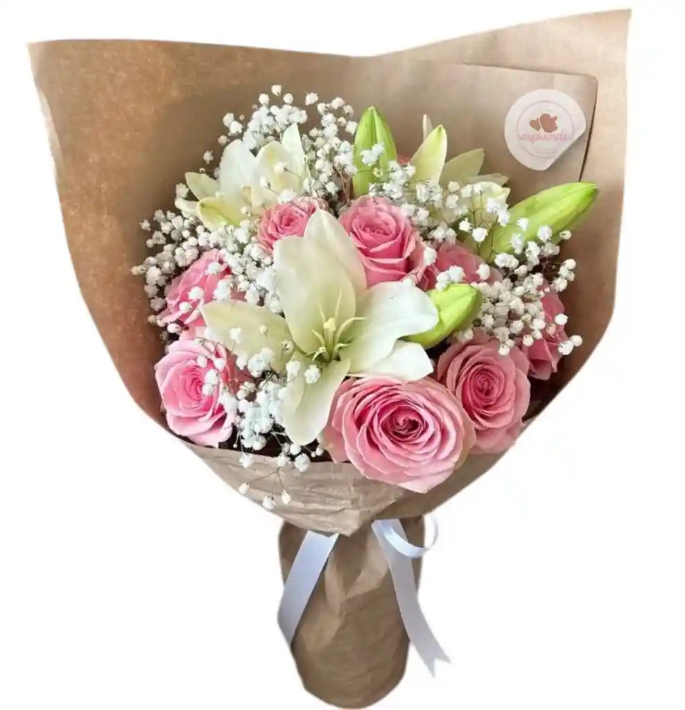 "¿Buscas el detalle perfecto para expresar tu cariño? Nuestro bouquet de rosas rosadas es la respuesta. Suavidad y dulzura en cada pétalo, ideal para celebrar un cumpleaños, un aniversario, o simplemente para decirle a alguien: 'Gracias por ser parte de mi vida'. ¡Un regalo que enamora con ternura!" BOUQUET CON: 12 ROSAS ROSADAS ,LIRIO BLANCO ,PERLA ,MOÑO Y TARJETA PERSONALIZADA