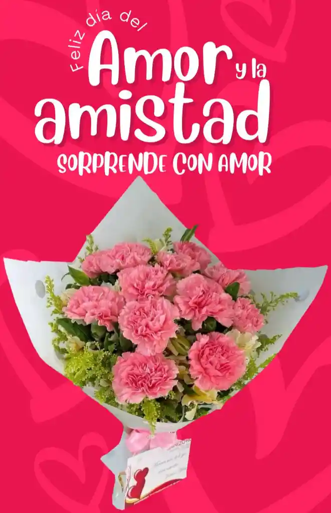 BOUQUET CON CLAVELES ROSADOS ASTROMELIAS FOLLAJE AMARILLO PAPEL DECORATIVO , TERJETA PERSONALIZADA
