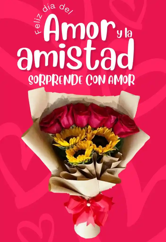 BOUQUET CON 6 ROSAS Y 3 GIRASOLES PAPEL DECORATIVO MOÑO , TARJETA PERSONALIZADA