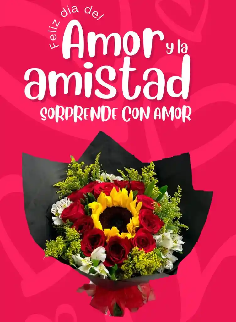 BOUQUET CON ROSAS GIRASOL ASTROMELIAS FOLLAJE AMARILLO PAPEL DECORATIVO MOÑO , TARJETA PERSONALIZADA