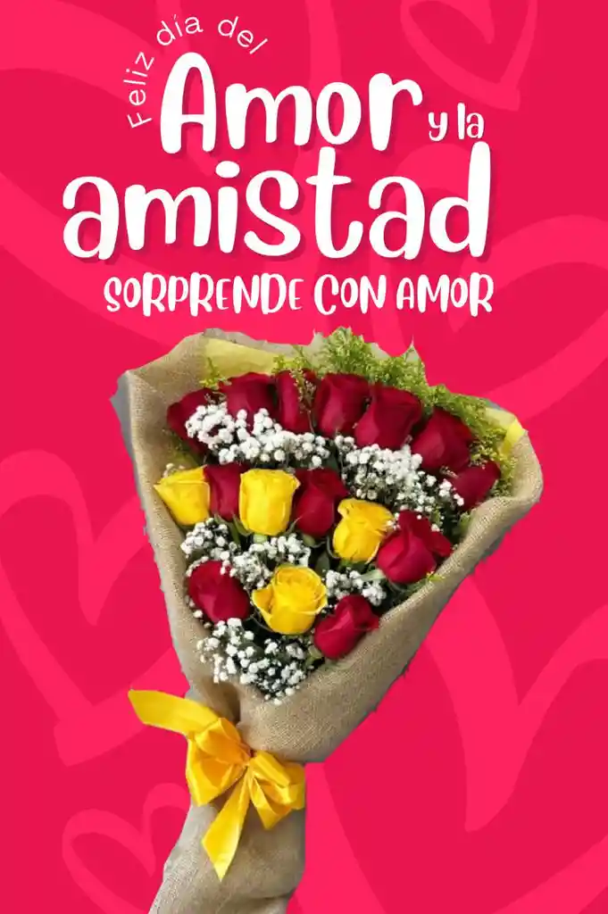 BOUQUET CON 16 ROSAS ROJAS Y AMARILLAS PERLAFOLLAJE AMARILLO YUTE MOÑO TARJETA PERSONALIZADA