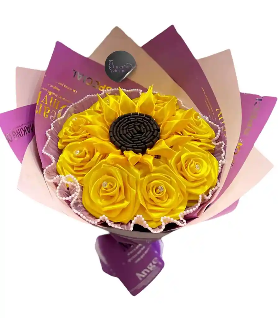 BOUQUET CON ROSAS ETERNAS DE COLOR AMARILLO ,GIRASOL ,DECORASION ,PAPEL DECORATIVO , TARJETA PERSONALZADA