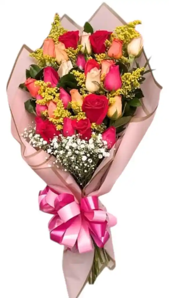 BOQUET ALARGADO CON ROSAS SURTIDAS, FOLLAJE, PAPEL DECORATIVO, MAOÑO, TARJETA PERSONALIZADA