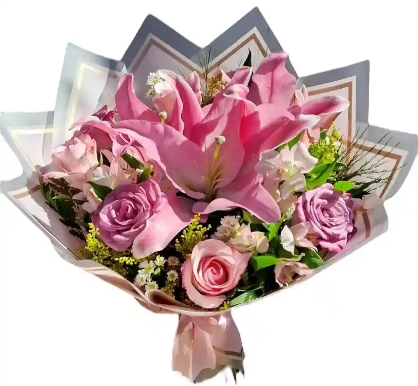 BOUQUET CON ROSAS ROSADAS , LIRIO , ASTROMELIAS, FOLLAJE , PAPEL DECORATIVO , MOÑO , TARJETA PERSONALIZADA