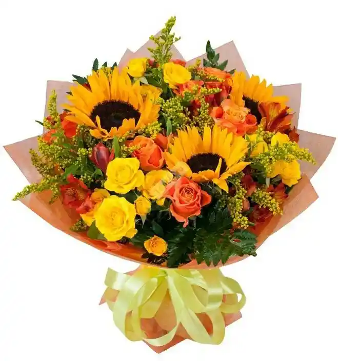 BOUQUET CON GIRASOLES , ROSAS , ASTRONMELIAS , FOLLAJE , PAPEL DECORATIVO , MOÑO , TARJETA PERSONALIZADA