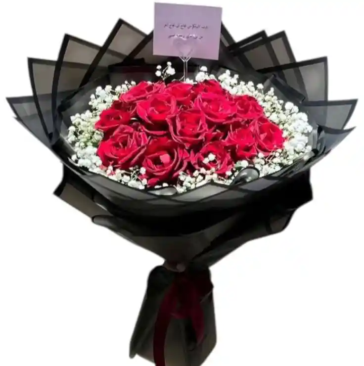 BOUQUET CON 24 ROSA ROJAS , PERLA , PAPEL DECORATIVO , MOÑO , TARJETA PERSONALIZADA ,