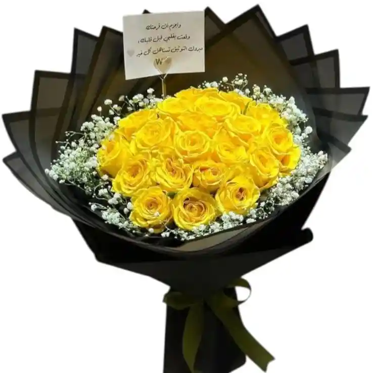 BOQUQTE CON 24 ROSAS AMARILLAS , PERLA , MAÑO , PAPEL DECORATIVO , TARJETA PERSONALIZADA