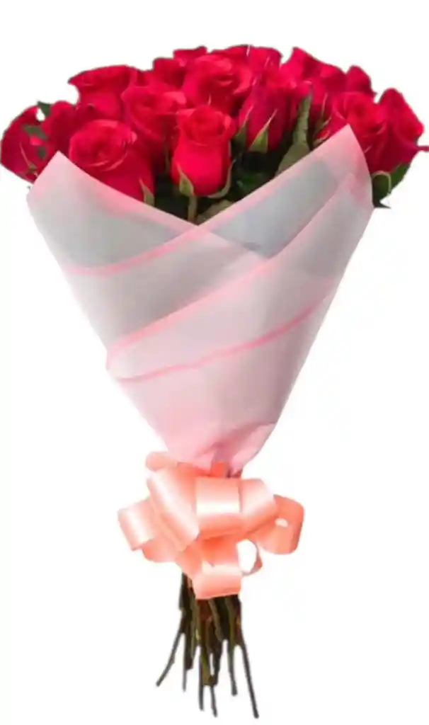 BOUQUET CON 24 ROSAS FUCSIA , PAPEL DECORATIVO , MOÑO , TERJETA PERSONALIZADA