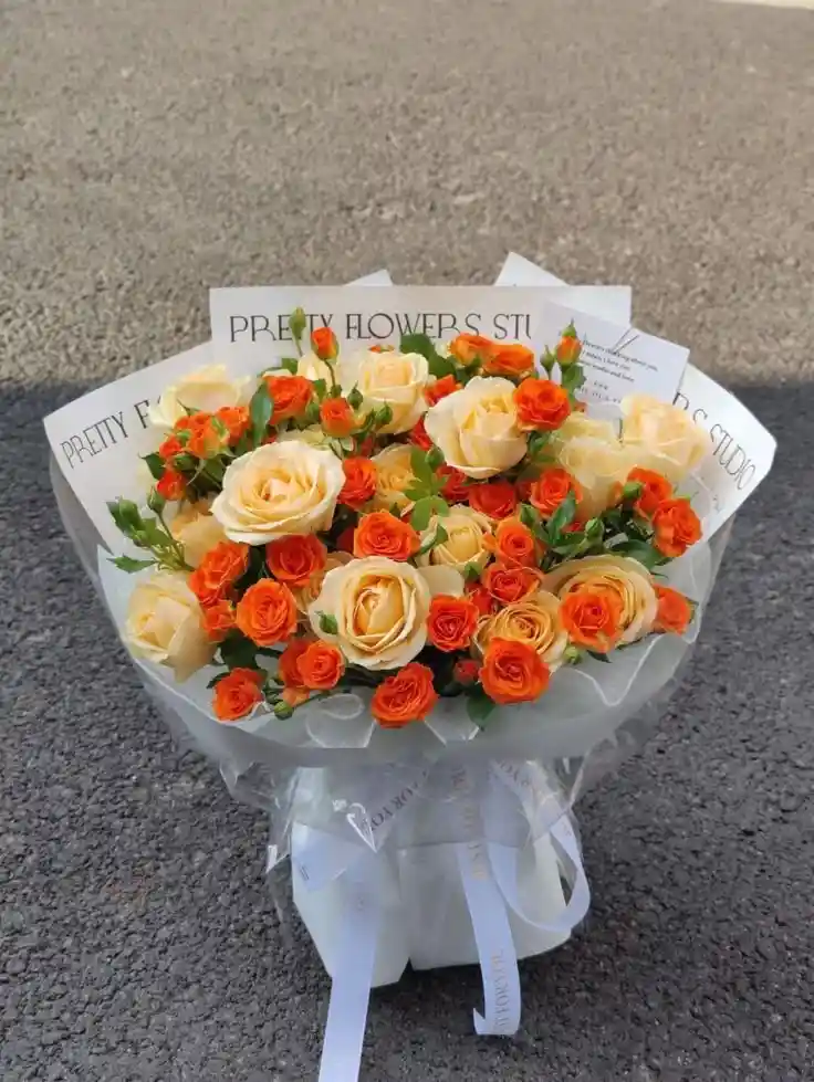 Bouquet de 12 rosa blanca y rosa mini naranja Nota: La flor puede ser sustituida dependiendo la disponibilidad de color y del producto “Mensaje Personalizado” máximo de 30 caracteres (Dejar el mensaje en el chat, los comentarios no se previsualizan para la tienda por lo que si se dejan allí no podrá ser incluido).