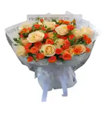 Bouquet de 12 rosa blanca y rosa mini naranja Nota: La flor puede ser sustituida dependiendo la disponibilidad de color y del producto “Mensaje Personalizado” máximo de 30 caracteres (Dejar el mensaje en el chat, los comentarios no se previsualizan para la tienda por lo que si se dejan allí no podrá ser incluido).