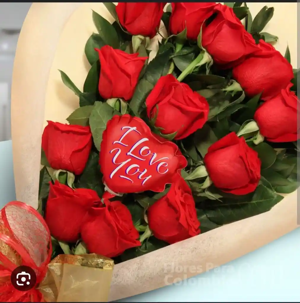 Bouquet de 12 rosas rojas con follaje y globo pequeño forma de corazón con mensaje envueltas en papel Kraft con moño rojo