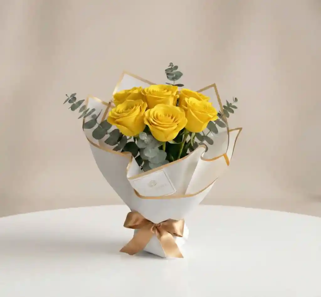 Bouquet de Rosas Amarillas en Bogotá – Fruit Santé Elegancia minimalista que ilumina el día. Nuestro bouquet de rosas amarillas premium con eucalipto llega en empaque blanco con ribete dorado y lazo de satín. Un detalle moderno, de líneas limpias, listo para entrega el mismo día en Bogotá (pedidos antes de 5:00 p.m.). ¿Para quién y para qué momento es ideal? Amistad auténtica: expresa cercanía y gratitud sin formalismos. Agradecimiento: un “gracias” elegante para alguien que te ayudó. Ánimo y recuperación: colores que transmiten energía y esperanza. Logros y metas: ascensos, graduaciones, nuevos comienzos. Detalles espontáneos: ilumina el día de esa persona detallista. Empresarial: recepción, bienvenida de clientes o reconocimiento interno. Detalles del bouquet Composición sugerida: rosas amarillas seleccionadas (tallo firme, botón abierto) con eucalipto silver dollar. Presentación: papel blanco premium con filo dorado y lazo de satín Fruit Santé. Incluye: tarjeta para mensaje personalizado. Nota: la selección puede variar levemente según disponibilidad estacional manteniendo el estilo y la paleta.