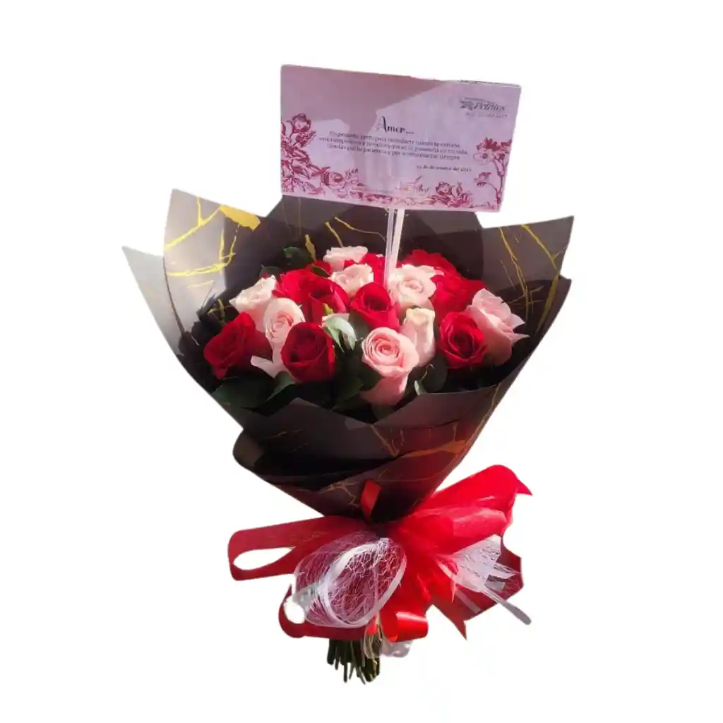 Hermoso bouquet de 24 rosas rojas y rosadas, con moño decorativo. Perfecto para toda ocasión.