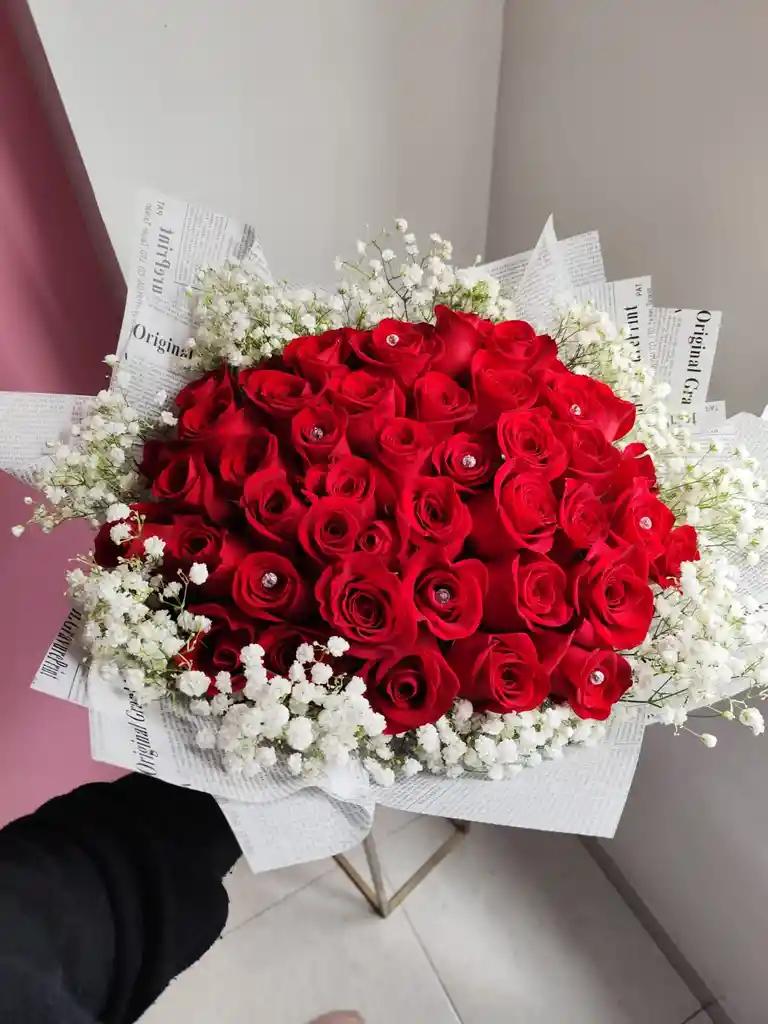 Un elegante y romántico bouquet compuesto por 72 rosas frescas de la más alta calidad, acompañado de delicadas gypsofilias que realzan su belleza natural. Presentado en una fina envoltura de papel coreano, cuidadosamente decorado para lograr un acabado sofisticado y encantador. Incluye: *Tarjeta personalizada con dedicatoria *Decoración especial del bouquet *Recomendaciones para el cuidado de las flores *Sobrecito de alimento floral para prolongar su frescura El detalle perfecto para expresar amor, gratitud o celebrar una ocasión especial con estilo y elegancia. Nota importante: Por favor, deja el mensaje de dedicatoria y cualquier indicación adicional en el chat de la aplicación al momento de hacer tu pedido. Esto nos ayudará a personalizar tu arreglo con el mayor cuidado posible.