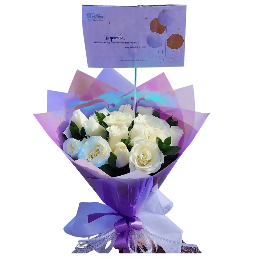 Hermoso bouquet de 15 rosas blancas con moño decorativo, perfecto para toda ocasión.