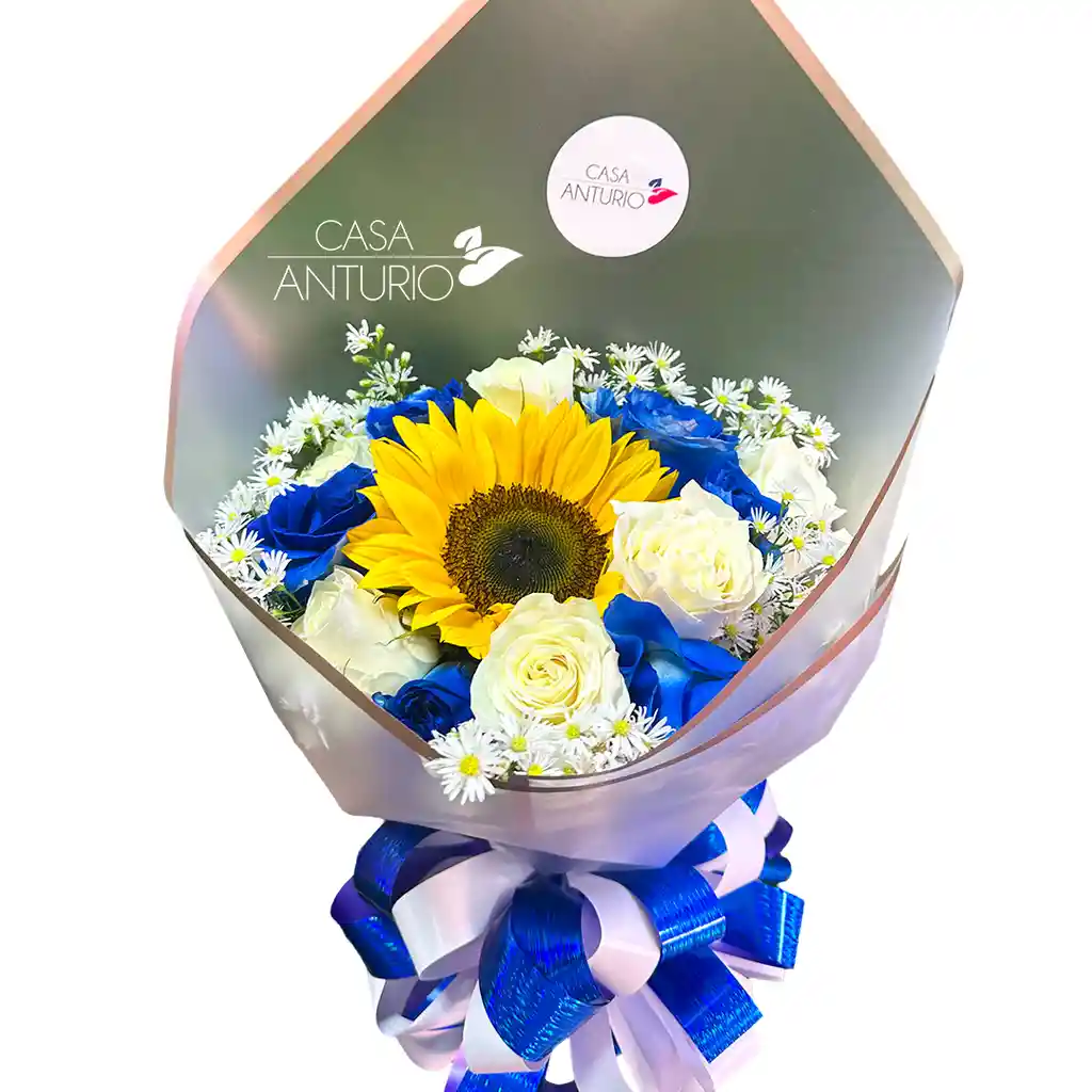 Bouquet de 12 rosas blancas y azules con girasol, acompañadas de follaje y envueltas en papel coreano con moño. Un diseño vibrante y armonioso que combina energía, calma y elegancia en un solo detalle.