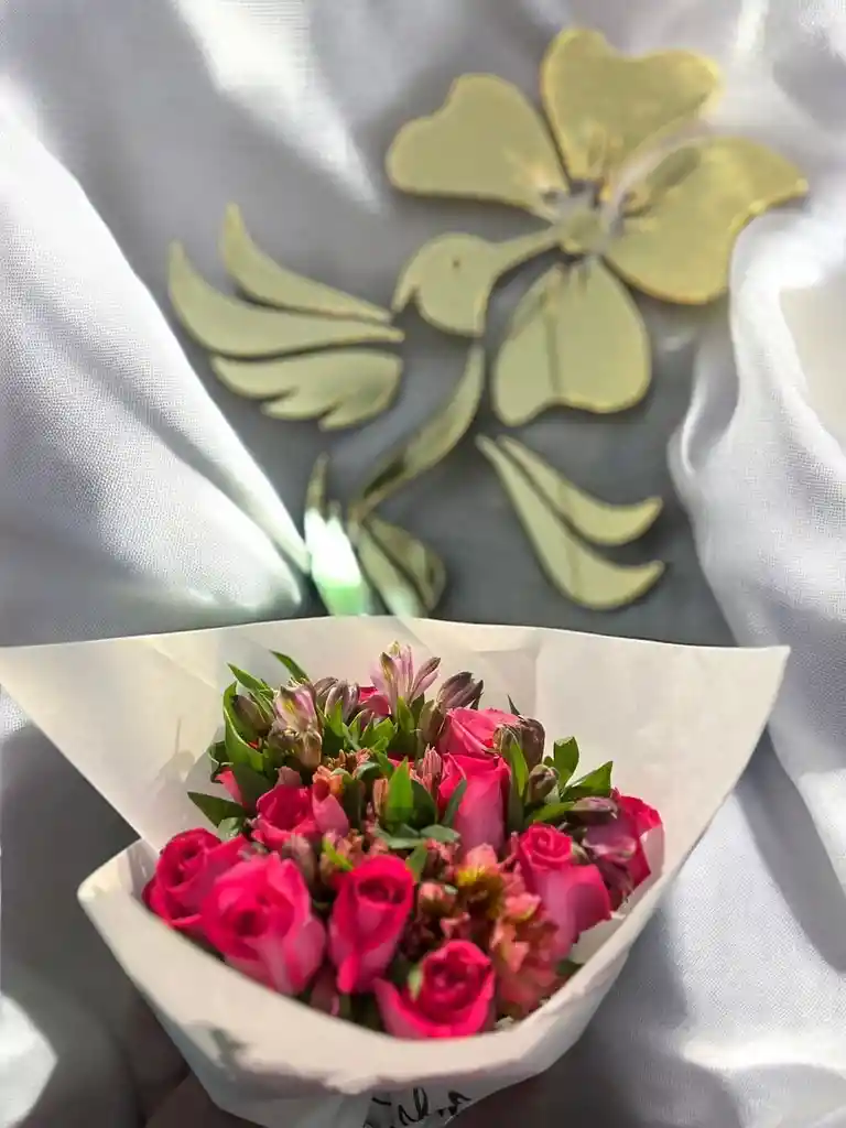 Bouquet con aprox. 12 rosas fucsias y 1 paquete de astromelia. Nota: La flor puede ser sustituida dependiendo la disponibilidad de color y del producto “Mensaje Personalizado” máximo de 30 caracteres (Dejar el mensaje en el chat, los comentarios no se previsualizan para la tienda por lo que si se dejan allí no podrá ser incluido).