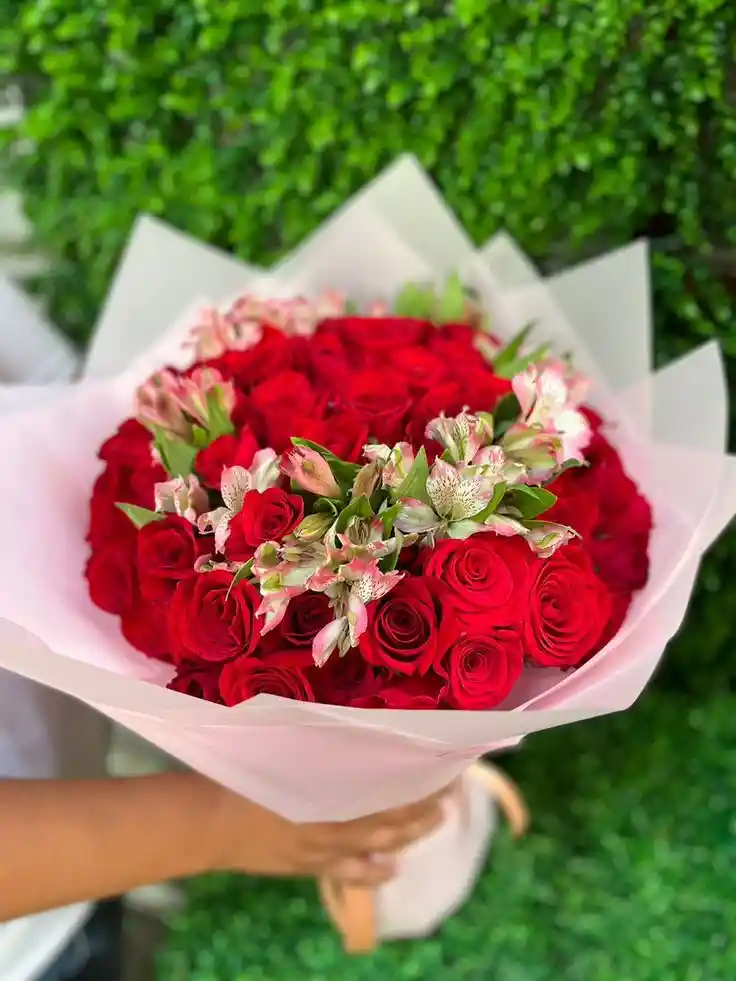 Bouquet con aprox. 24 rosas rojas 1 paquete de astromelia. Nota: La flor puede ser sustituida dependiendo la disponibilidad de color y del producto “Mensaje Personalizado” máximo de 30 caracteres (Dejar el mensaje en el chat, los comentarios no se previsualizan para la tienda por lo que si se dejan allí no podrá ser incluido).