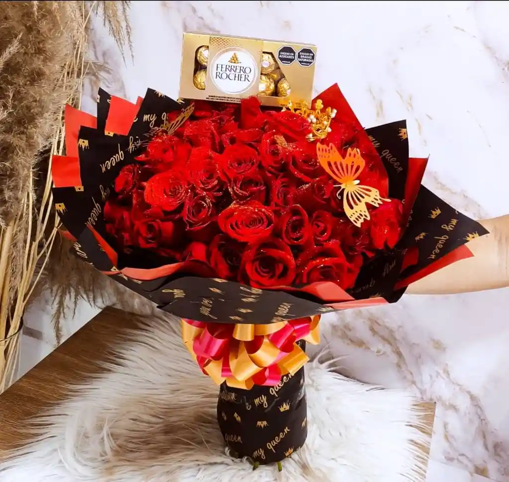 hermoso bouquet de rosas escarchadas acompañadas de ferrero rocher x4 incluye tarjeta personalizada