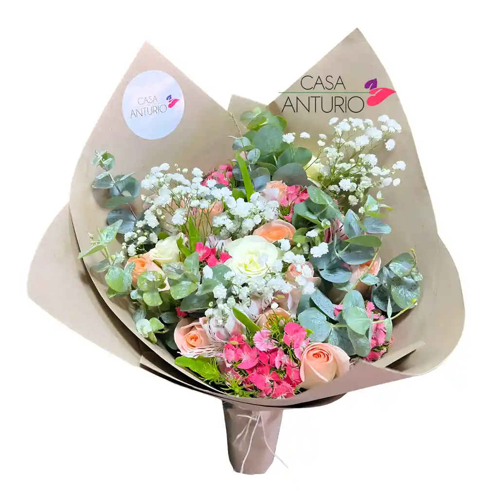 Bouquet de 12 rosas frescas acompañadas de eucalipto aromático, delicada perla decorativa y variedad de follajes, envueltas en papel kraft que resalta su belleza rústica y elegante. Un detalle lleno de encanto ideal para cualquier ocasión.