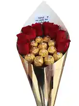 Un elegante bouquet compuesto por 12 rosas frescas acompañadas de deliciosos chocolates, perfecto para transmitir amor y ternura en cualquier ocasión especial. Nota: La flor puede ser sustituida dependiendo de la disponibilidad de color y del producto. "Mensaje Personalizado" máximo de 30 caracteres (Dejar el mensaje en el chat, los comentarios no se previsualizan para la tienda, por lo que si se dejan allí no podrá ser incluido).