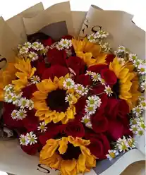 Bouquet de 24 rosas con 5 girasoles y margarita blanca mini Nota: La flor puede ser sustituida dependiendo la disponibilidad de color y del producto “Mensaje Personalizado” máximo de 30 caracteres (Dejar el mensaje en el chat, los comentarios no se previsualizan para la tienda por lo que si se dejan allí no podrá ser incluido).