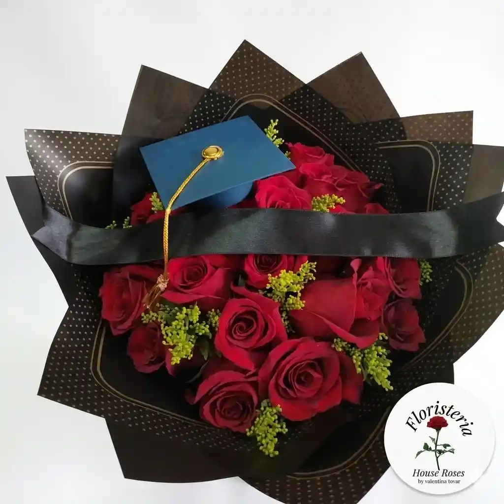 Un clásico que nunca falla ❤️ Este espectacular ramo está compuesto por rosas rojas frescas, cuidadosamente organizadas en un empaque elegante en tonos oscuros con detalles dorados. Incluye un birrete decorativo que lo hace perfecto para graduaciones.