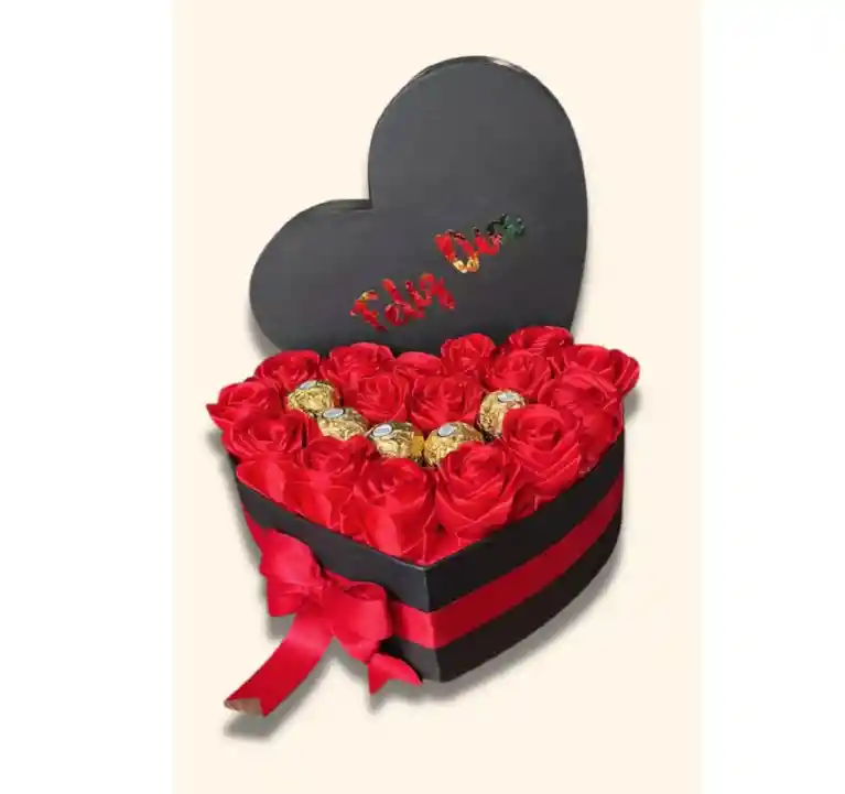 Caja en forma de corazón 23 Cm de ancho, diseñada en cartón industrial de 1.5 Mm con tapa rígida y sticker de elección, contiene de 16 a 20 rosas rojas elaboradas a mano con cinta sanitanada, 5 chocolates ferrero rocher, cinta y moño decorativo.