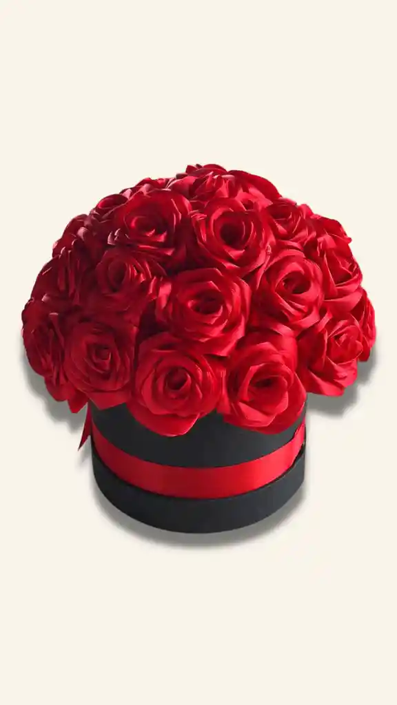 Caja en forma redonda 15 Cm de ancho, diseñada en cartón industrial de 1.5 Mm con tapa rígida , contiene de 30 a 35 rosas rojas elaboradas a mano con cinta sanitanada, cinta y moño decorativo.
