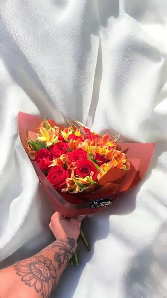 Bouquet de 12 rosas rojas acompañadas de astromelia. Nota: La flor puede ser sustituida dependiendo la disponibilidad de color y del producto “Mensaje Personalizado” máximo de 30 caracteres (Dejar el mensaje en el chat, los comentarios no se previsualizan para la tienda por lo que si se dejan allí no podrá ser incluido).