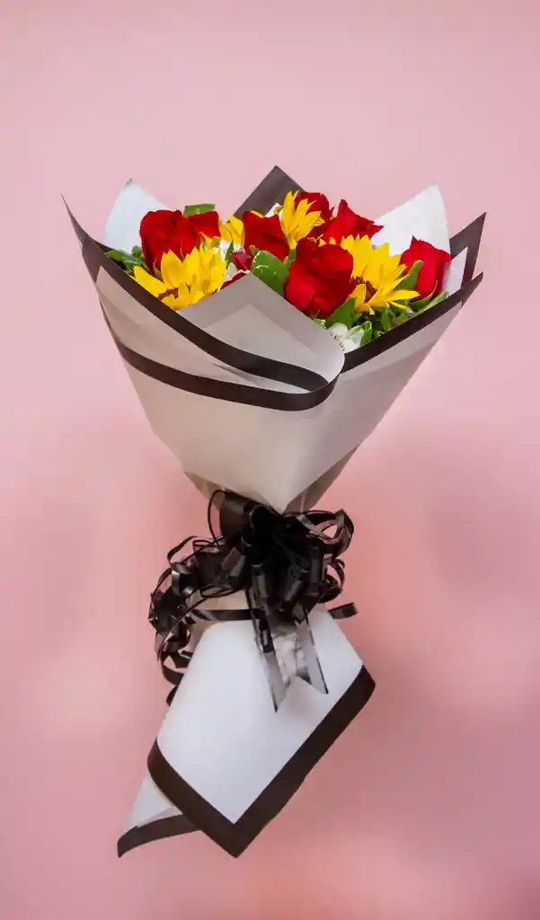 Este es un impactante y contrastante bouquet de flores naturales que combina la pasión de las rosas rojas con la alegría de los girasoles amarillos, creando un punto focal de colores primarios muy llamativos. El arreglo está complementado con flores de acento blancas (posiblemente alstroemerias o lirios pequeños) y un follaje verde intenso y brillante que añade frescura y profundidad. El bouquet está envuelto con un papel coreano, lo que contrasta dramáticamente con las flores. Finalmente, todo el conjunto está atado con un gran y voluminoso lazo, resultando en un bouquet audaz, moderno y lleno de vitalidad.