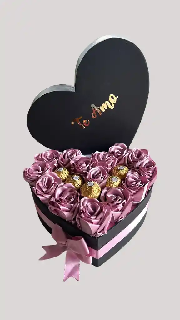 Caja en forma de corazón 23 Cm de ancho, diseñada en cartón industrial de 1.5 Mm con tapa rígida y sticker de elección, contiene de 16 a 20 rosas rosadas elaboradas a mano con cinta sanitanada, 5 chocolates ferrero rocher, cinta y moño decorativo.