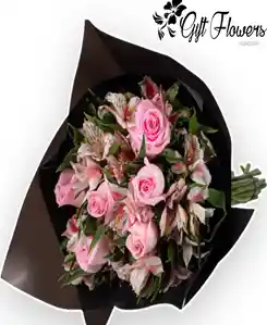Bouquet de 12 rosas rosadas con 10 varas de astromelia fucsia. La flor puede ser sustituida dependiendo la disponibilidad de color y del producto “Mensaje Personalizado” máximo de 30 caracteres (Dejar el mensaje en el chat, los comentarios no se previsualizan para la tienda por lo que si se dejan allí no podrá ser incluido)