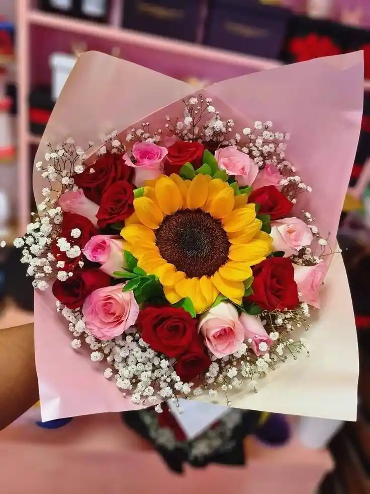 Bouquet de 20 rosas rosadas y rojas con1 girasol y gypsophila Nota: La flor puede ser sustituida dependiendo la disponibilidad de color y del producto “Mensaje Personalizado” máximo de 30 caracteres (Dejar el mensaje en el chat, los comentarios no se previsualizan para la tienda por lo que si se dejan allí no podrá ser incluido).