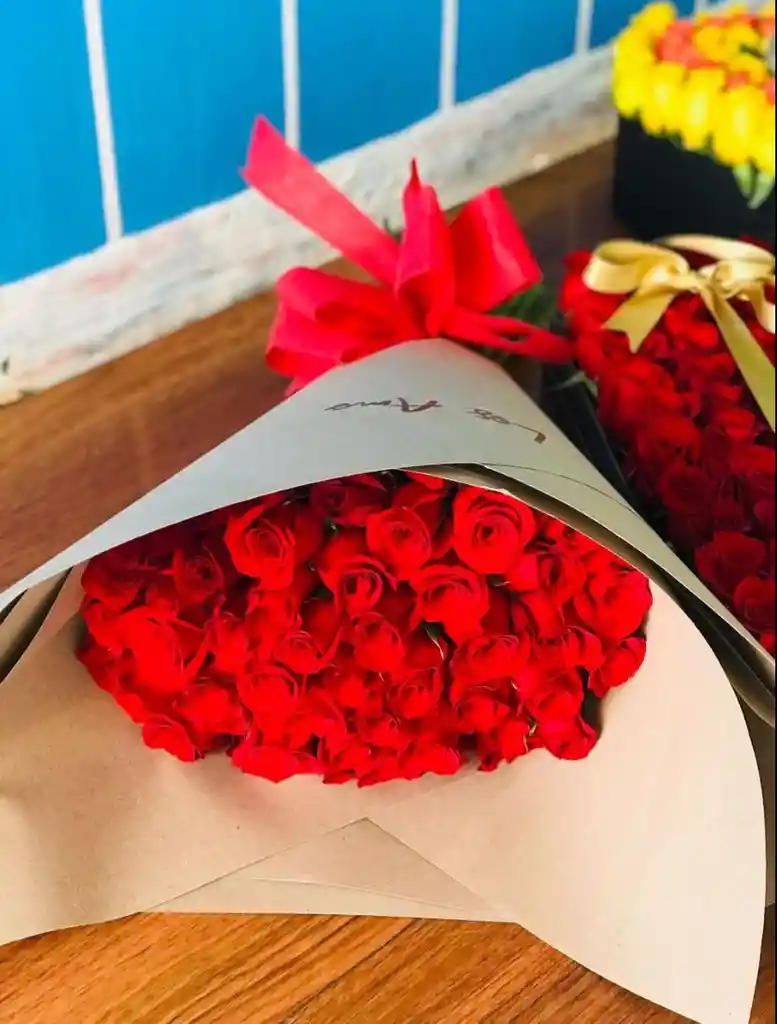 Bouquet de 50 tallos de rosas (hasta 2 tonos, segun color a disponibilidad) con mensaje personalizado maximo 50 caracteres (dejar mensaje en el chat,los mensajes no se pueden visualizar solo de esta manera, de lo contrario no podra ser incluido )