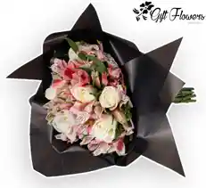 Bouquet de 12 rosas blancas con 10 varas de astromelia fucsia. La flor puede ser sustituida dependiendo la disponibilidad de color y del producto “Mensaje Personalizado” máximo de 30 caracteres (Dejar el mensaje en el chat, los comentarios no se previsualizan para la tienda por lo que si se dejan allí no podrá ser incluido)