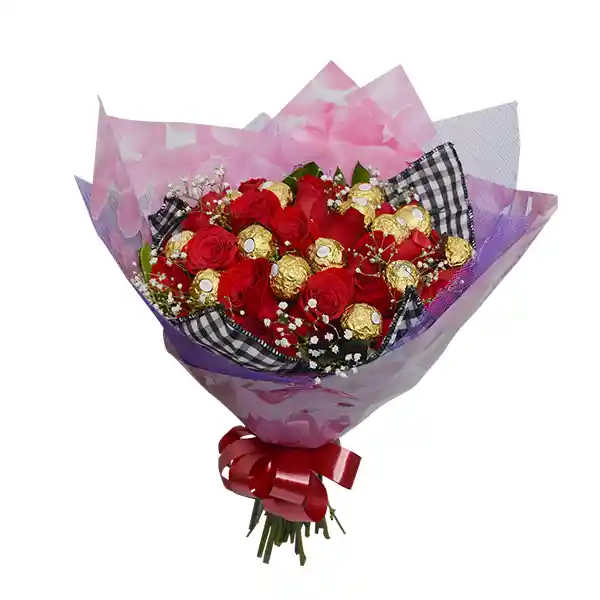 BOUQUET DE ROSAS CON FERRERO Y DE DECORACIÓN