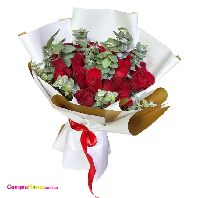 Bouquet de 24 rosas y eucalipto con tarjeta personalizada