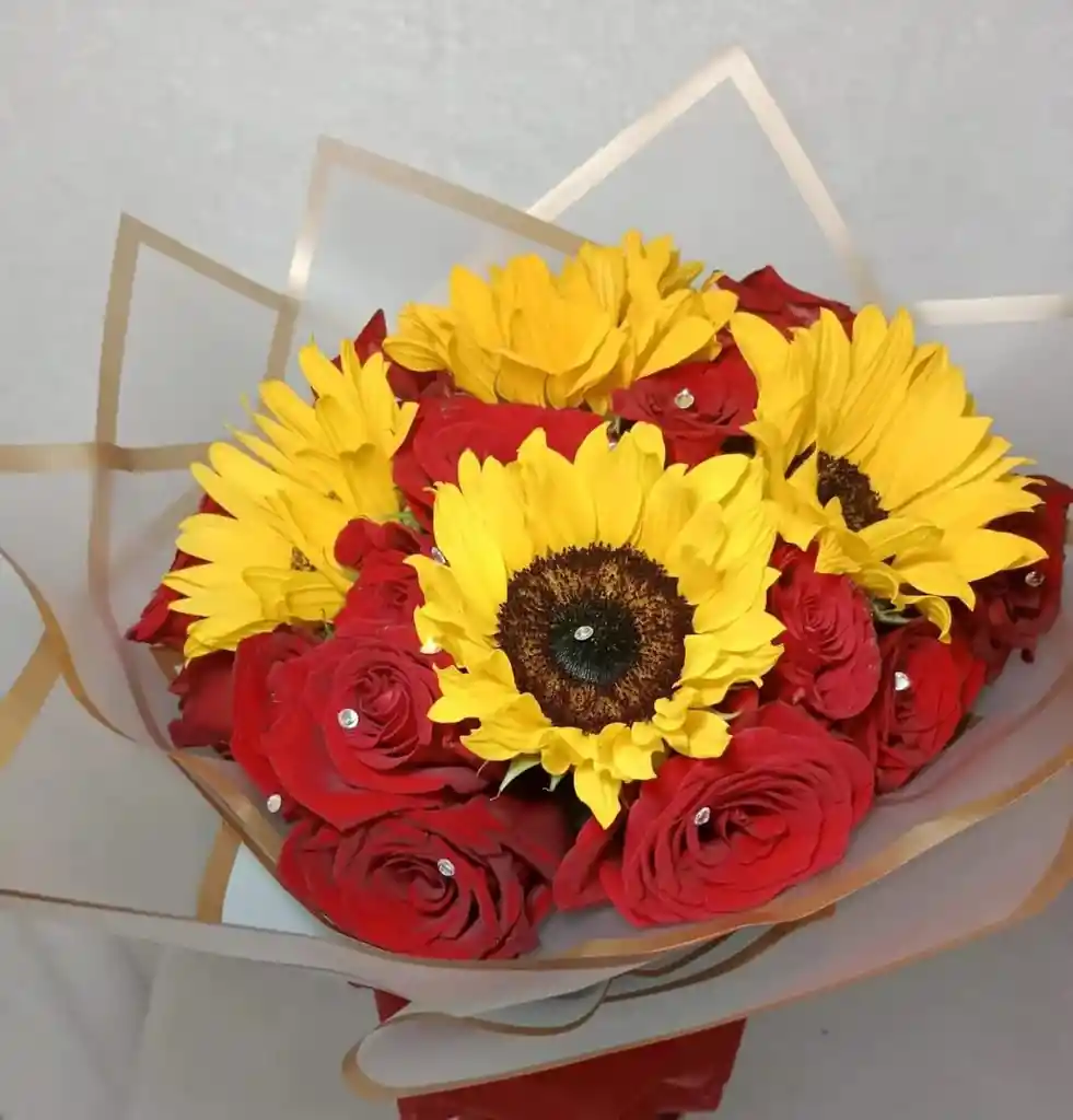 hermoso bouquet de rosas y girasoles incluye tarjeta personalizadaa