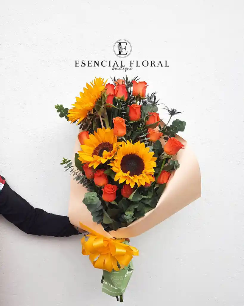 Bouquet de dos docena Rosas (color según disponibilidad) más Girasoles, eringio y eucalipto baby de color Multicolor ideal para el Felicitaciones
