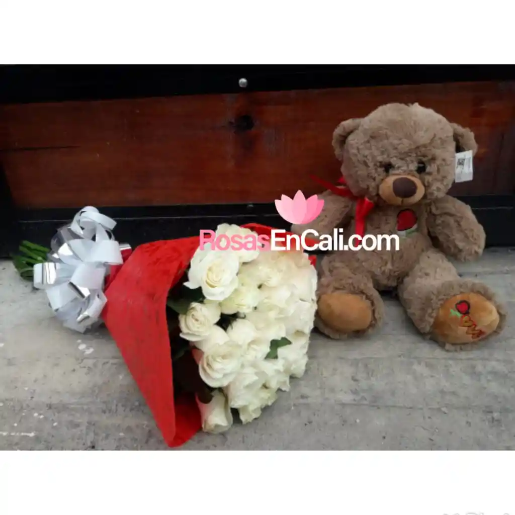Bouquet de 24 rosas blancas y peluche de 30cm