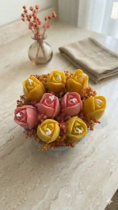 Un bouquet artesanal de 9 tulipanes en vela de cera premium de colores surtidos y complementarios, acompañados de flores naturales secas y presentados sobre una base de hormigón hecha a mano. Cada tulipán tiene un aroma sorpresa seleccionado entre: eucalipto, té verde, canela, chocolate, frutos rojos, rosas, jazmín, borgoña y dulces de antaño. Hecho a mano en Colombia 🇨🇴 · Pet friendly 🐾 · Ideal para regalar o decorar.