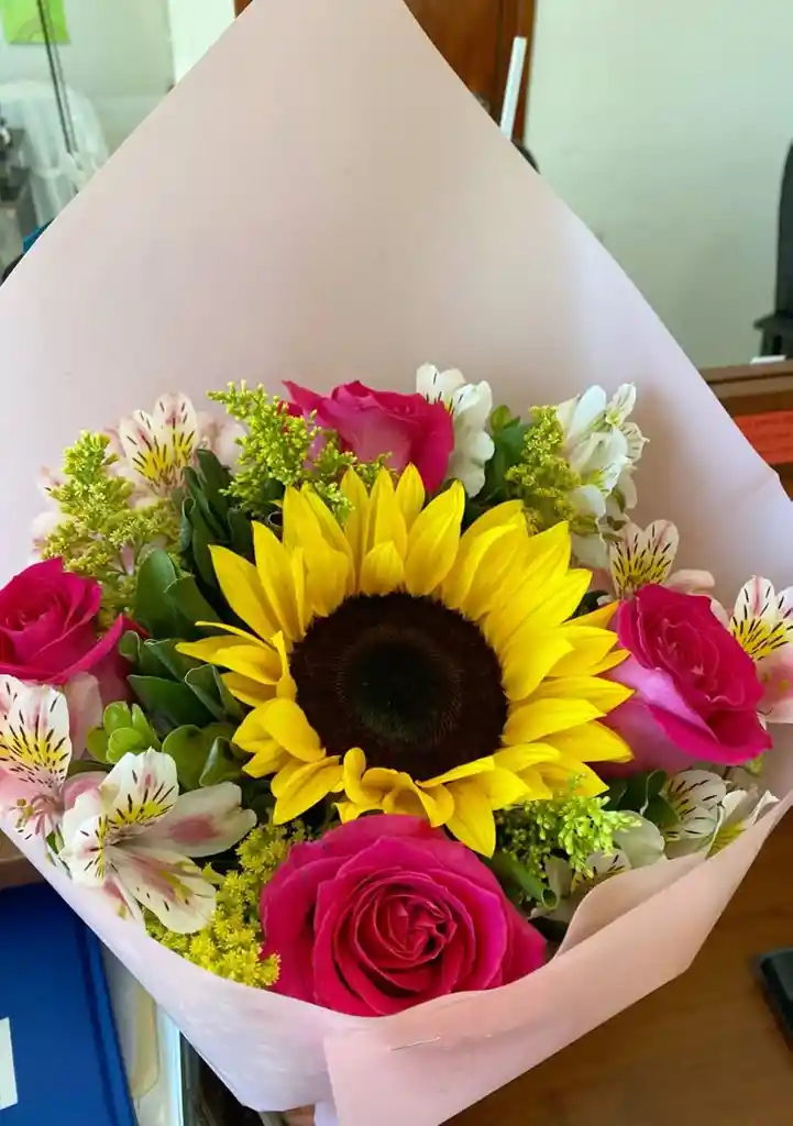 Este arreglo floral, envuelto en un elegante papel rosa pálido, es la combinación perfecta de calidez y alegría. Su diseño audaz lo hace ideal para celebrar la vida, dar ánimo o simplemente para enviar un mensaje lleno de optimismo.