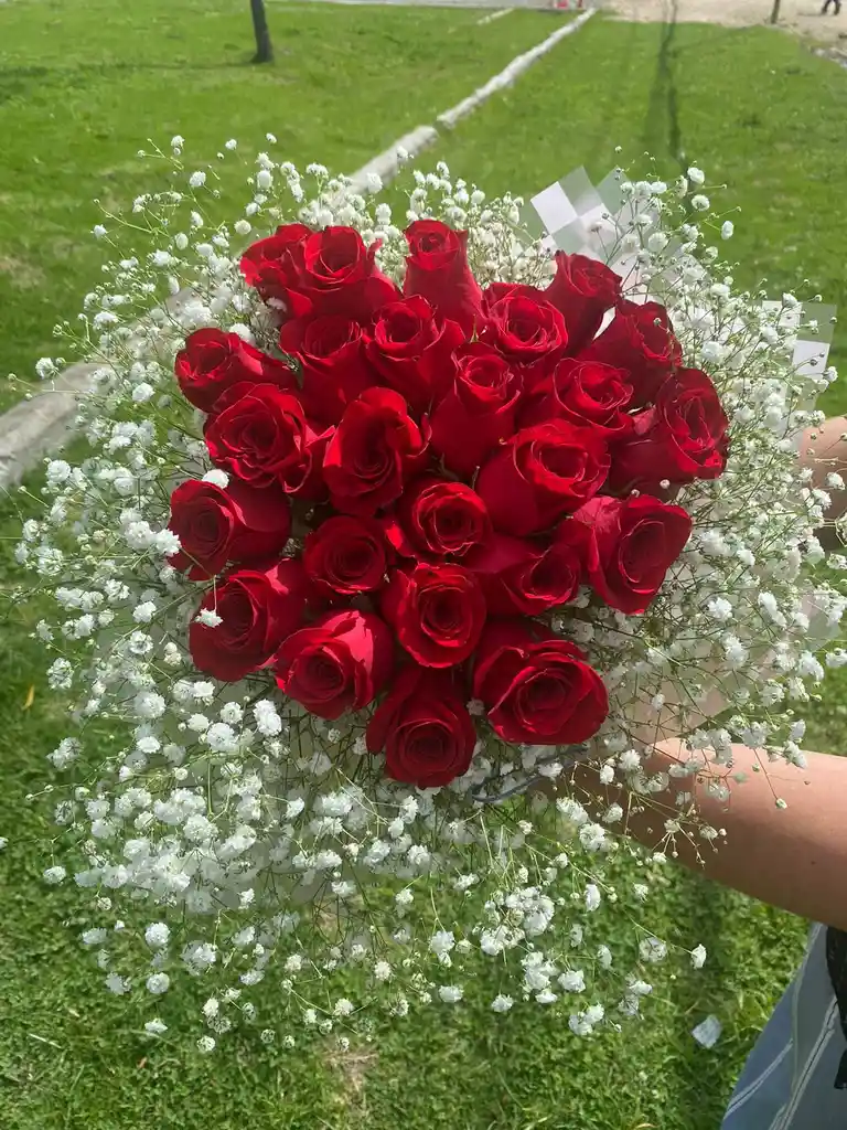 Bouquet elaborado con 24 rosas y gypso