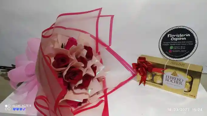 Entre delicados pétalos rosados y rojos, “Detalles que Enamoran” florece como un susurro de amor que se acompaña de dulzura. Este encantador bouquet de rosas, envuelto en tonos suaves y románticos, se complementa con una caja de chocolates Ferrero Rocher, creando el regalo perfecto para decir “estoy pensando en ti”. Ideal para enamorar, agradecer o sorprender, este detalle habla con ternura lo que el corazón calla. 📌 Si deseas incluir tarjeta, recuerda solicitarla al momento de tu pedido. Sugerencia de mensaje: "En cada flor, un pensamiento. En cada chocolate, un suspiro por ti." 📦 Nota: El tipo de empaque puede variar según disponibilidad en tienda. 💌 Creación delicada de Floristería Ospina, donde cada flor es una forma de decir “te quiero” sin necesidad de palabras.