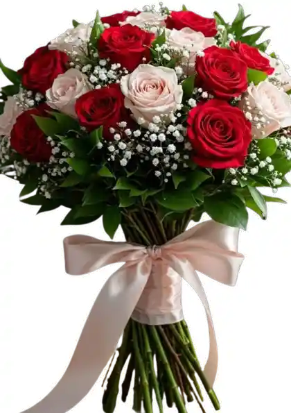 Un bouquet encantador compuesto por rosas rojas vibrantes y rosas rosa suave, acompañado de delicado velo de novia y follaje fresco que aporta volumen y un acabado natural. Cada tallo está cuidadosamente seleccionado para crear una armonía visual perfecta, realzada por un lazo satinado color marfil que aporta un toque de sutileza y elegancia. Ideal para aniversarios, celebraciones especiales, agradecimientos o para sorprender con un gesto lleno de ternura y romanticismo. Su combinación de tonos cálidos y suaves lo convierte en un arreglo equilibrado, refinado y memorable.