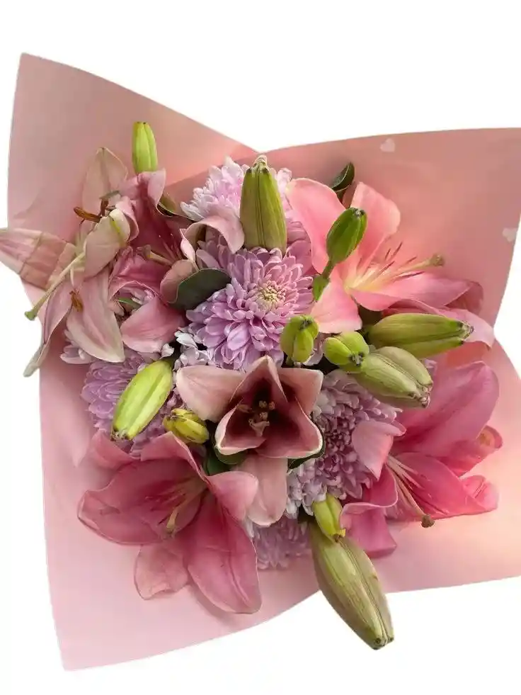 Bouquet rosado de 5 varas lirios rosados y 6 crisantemos morados Nota: La flor puede ser sustituida dependiendo la disponibilidad de color y del producto “Mensaje Personalizado” máximo de 30 caracteres (Dejar el mensaje en el chat, los comentarios no se previsualizan para la tienda por lo que si se dejan allí no podrá ser incluido).