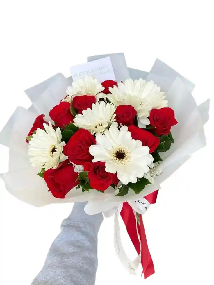 Bouquet de 12 rosas rosas con 5 gérberas blancas Nota: La flor puede ser sustituida dependiendo la disponibilidad de color y del producto “Mensaje Personalizado” máximo de 30 caracteres (Dejar el mensaje en el chat, los comentarios no se previsualizan para la tienda por lo que si se dejan allí no podrá ser incluido).