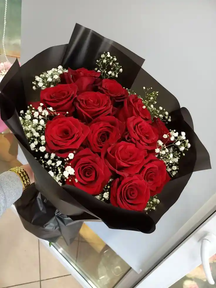 Impactante ramo de 24 rosas rojas premium con nube blanca, envuelto en papel negro para un contraste sofisticado y moderno. El detalle perfecto para conquistar y enamorar.